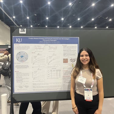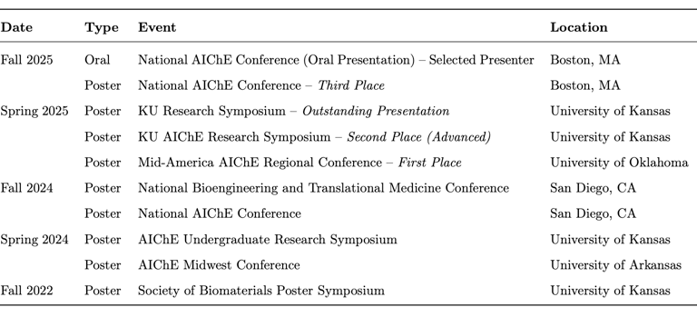 Selected as 1 of 6 undergraduates to give an oral presentation at the AIChE National Student Conference (2025); received 1st place at AIChE Mid-America Regional Conference, 2nd at KU C&PE Research Symposium, and 3rd at AIChE National Poster Competition (Food, Pharma & Biotech II Division).